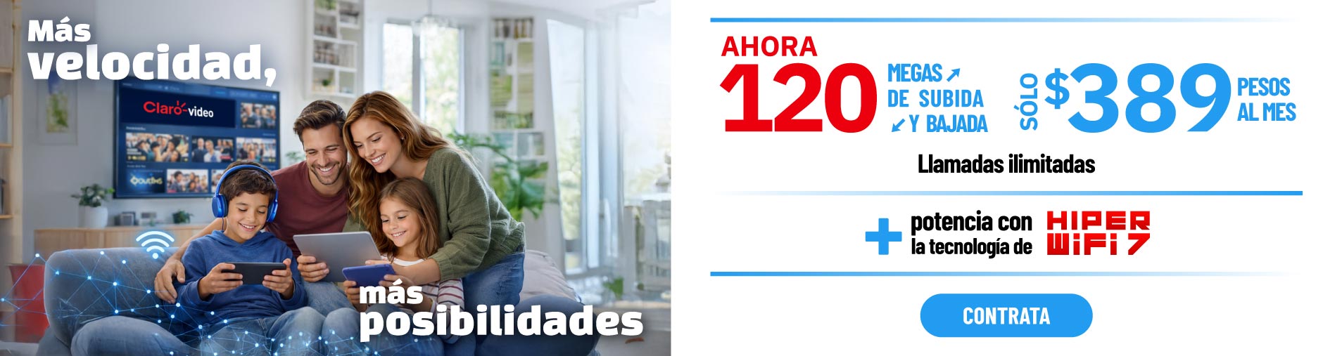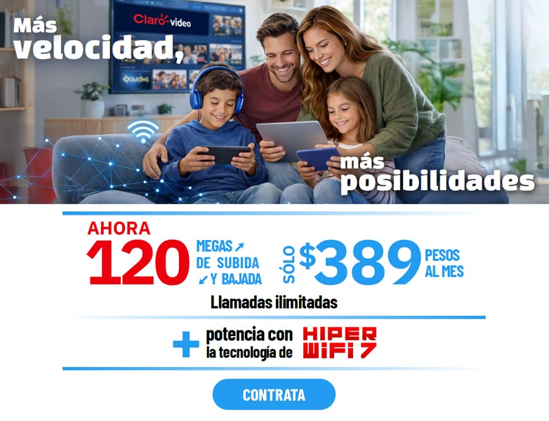 Precios con impuestos incluidos. La renta incluye llamadas ilimitadas a números fijos y móviles en México, Estados Unidos, Canadá y hasta 180 países más, consulta lista de destinos completa en telmex.com/destinosLDI. Las velocidades comunicadas son en Megas (Megabits por segundo) y corresponden a la velocidad máxima de transferencia de datos ofrecida y alcanzable, la velocidad de bajada y subida podrá variar en función de las condiciones técnicas del módem, cantidad de dispositivos conectados simultáneamente y/o la distancia entre el domicilio del usuario y la central. A partir del 7o mes el cliente continuará con la velocidad de su paquete originalmente contratado. La velocidad aplica para usuarios activos sin adeudos en sus servicios de telecomunicaciones y nuevos que cuentan con fibra óptica instalada. Hiper Wifi 7 no está incluido. La oferta corresponde a un precio de contado de $2,799 o 12 mensualidades fijas de $239 por la adquisición 2 equipos Mesh “HIPER WiFi 7” (incluye 2 equipos Mesh, 2 cables de red Ethernet y 2 adaptadores de corriente). Promoción aplicable a usuarios nuevos y existentes. CAT mensual del 4.7%. Consulta disponibilidad y compra en Centros de Atención Telmex y en telmex.com/tiendaenlinea. Clientes No Infinitum, pueden verificar disponibilidad y precios en esta misma página. Los equipos serán entregados en el domicilio de tu Recibo Telmex. Plazos, condiciones, inscripciones IFT (ahora CRT) y velocidades promedio de descarga aplicables en telmex.com/terminoshogar. Vigencia al 31 de marzo de 2026.