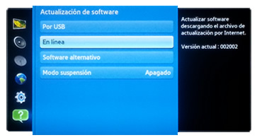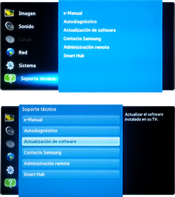 2. Con el control remoto de tu dispositivo, accede al menú de opciones (usando la tecla MENÚ) hasta el último ícono marcado con un signo de interrogación (Soporte técnico) y selecciona la opción "Actualización de software".