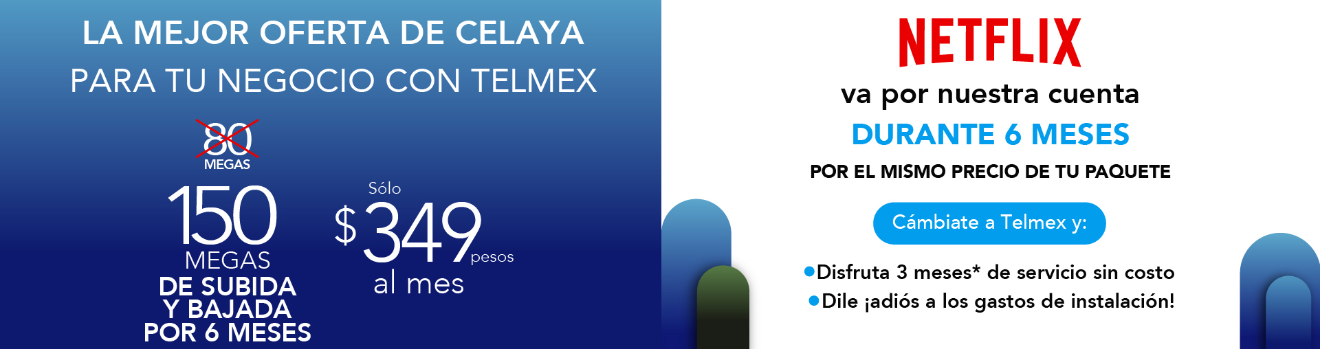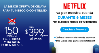 La oferta anunciada corresponde a la contratación del Paquete Conectes Negocio + Netflix Estándar con anuncios. Precios con impuestos incluidos. Las velocidades comunicadas son en Megas (Megabits por segundo), y corresponden a la velocidad máxima de transferencia de datos ofrecida y alcanzable, la velocidad de bajada y subida podrá variar en función de las condiciones técnicas del módem, cantidad de dispositivos conectados simultáneamente y/o la distancia entre el domicilio del usuario y la central. A partir del 7o mes el cliente continuará con la velocidad de su paquete originalmente contratado Paquete Conectes Negocio (80 Megas). *La velocidad y Promoción de 100% de descuento en la renta de los meses 4, 8 y 12 (sobre servicio de telecomunicaciones) y promoción de descuento del 100% en gastos de instalación ($1,600 con impuestos), aplican para usuarios nuevos que cuentan con fibra óptica instalada y que realizan el trámite de Portabilidad o que quieren que Telmex sea su proveedor de servicios. Netflix todos los derechos reservados. Precios válidos para contrataciones realizadas a partir del 8 de octubre de 2024, a partir del 7° mes se pagará la renta de Netflix. “Netflix”, Claro Drive y las Soluciones Negocio son servicios proporcionados por terceros. Consulta plazos, beneficios, promociones, condiciones, inscripciones IFT (ahora CRT) y velocidades promedio de descarga aplicables en telmex.com/terminosnegocio