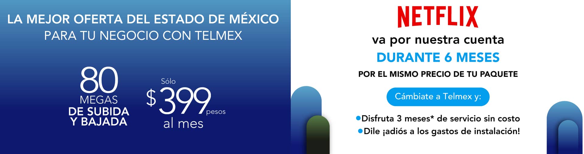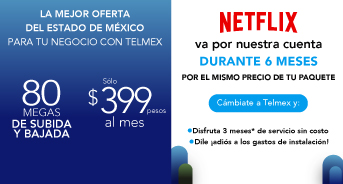 Portabilidad: Precios con impuestos incluidos. La renta incluye llamadas ilimitadas a números fijos y móviles en México, Estados Unidos, Canadá y hasta 180 países más, consulta lista de destinos completa en telmex.com/destinosLDI Las velocidades comunicadas son en Megas (Megabits por segundo) y corresponden a la velocidad máxima de transferencia de datos ofrecida y alcanzable, la velocidad de bajada y subida podrá variar en función de las condiciones técnicas del módem, cantidad de dispositivos conectados simultáneamente y/o la distancia entre el domicilio del usuario y la central. La velocidad aplica para usuarios activos y nuevos que cuentan con fibra óptica instalada. Promoción de 100% de descuento en la renta de los meses 4, 8 y 12 (sobre servicio de telecomunicaciones) y promoción de descuento del 100% en gastos de instalación ($1,600 con impuestos), aplican para clientes que realizan el cambio de su servicio de telecomunicaciones a Telmex. Netflix 2 pantallas Full HD, estándar con anuncios. Todos los derechos reservados. A partir del 7° mes se pagará la renta del OTT. Netflix, Claro Drive y Soluciones Negocio son servicios proporcionados por un tercero. Plazos, condiciones, inscripciones IFT (ahora CRT) y velocidades promedio de descarga aplicables en telmex.com/terminosnegocio