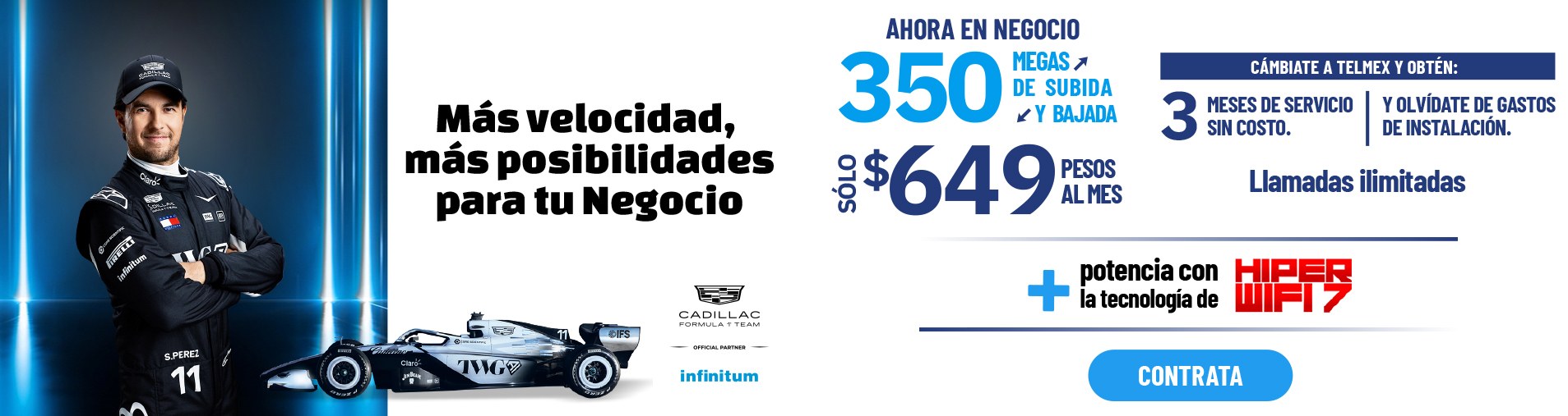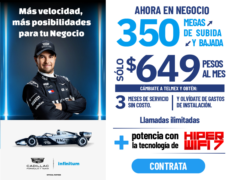 Precios con impuestos incluidos. Las velocidades comunicadas son en Megas (Megabits por segundo) y corresponden a la velocidad máxima de transferencia de datos ofrecida y alcanzable, la velocidad de bajada y subida podrá variar en función de las condiciones técnicas del módem, cantidad de dispositivos conectados simultáneamente y/o la distancia entre el domicilio del usuario y la central. A partir del 7o mes el cliente continuará con la velocidad de su paquete originalmente contratado. La velocidad aplica para usuarios nuevos que cuentan con fibra óptica instalada. Promoción de 100% de descuento en la renta de los meses 4, 8 y 12 (sobre servicio de telecomunicaciones) y promoción de descuento del 100% en gastos de instalación ($1,600 con impuestos), aplican para clientes que realizan el cambio de su servicio de telecomunicaciones a Telmex.HBO Max básico con anuncios sin costo durante 6 meses. Todos los derechos reservados. A partir del 7°mes se pagará la renta del OTT. HBO Max y Antivirus Seguridad Internet son servicios proporcionados por un tercero. Plazos, condiciones, inscripciones IFT (ahora CRT) y velocidades promedio de descarga aplicables en telmex.com/terminosnegocio  Vigencia 30 de abril de 2026.