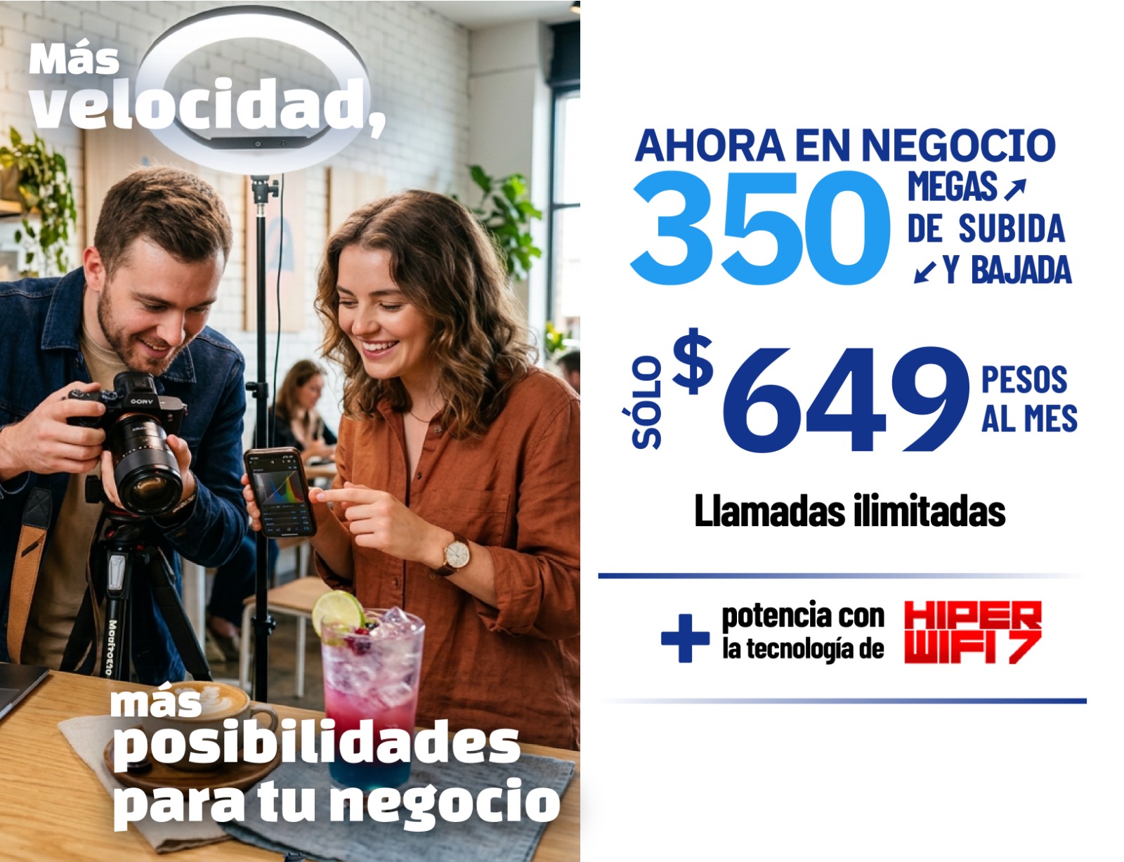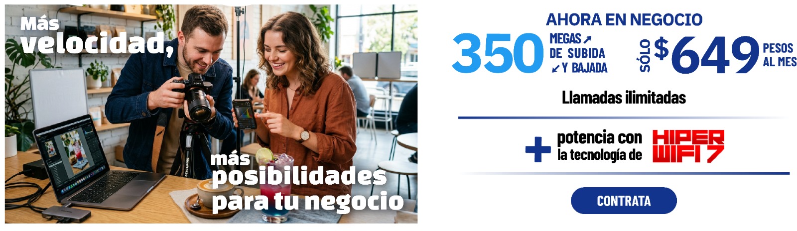 Precios con impuestos incluidos. La renta incluye llamadas ilimitadas a números fijos y móviles en México, Estados Unidos, Canadá y hasta 180 países más, consulta lista de destinos completa en telmex.com/destinosLDI Las velocidades comunicadas son en Megas (Megabits por segundo) y corresponden a la velocidad máxima de transferencia de datos ofrecida y alcanzable, la velocidad de bajada y subida podrá variar en función de las condiciones técnicas del módem, cantidad de dispositivos conectados simultáneamente y/o la distancia entre el domicilio del usuario y la central. A partir del 7o mes el cliente continuará con la velocidad de su paquete originalmente contratado. La velocidad aplica para usuarios activos sin adeudos en sus servicios de telecomunicaciones y nuevos que cuentan con fibra óptica instalada. Netflix 2 pantallas Full HD estándar con anuncios sin costo durante 6 meses. Todos los derechos reservados. A partir del 7° mes se pagará la renta del OTT. Netflix, Claro Drive y Soluciones Negocio son servicios proporcionados por un tercero. Hiper Wifi 7 no está incluido. La oferta anunciada corresponde a la adquisición de 2 equipos Mesh “HIPER WiFi 7” (incluye 2 equipos Mesh, 2 cables de red Ethernet y 2 adaptadores de corriente). Promoción aplicable a usuarios nuevos y existentes. CAT mensual del 4.7%. Consulta disponibilidad y compra en Centros de Atención Telmex y en telmex.com/tiendaenlinea Clientes No Infinitum, pueden verificar disponibilidad y precios en esta misma página. Los equipos serán entregados en el domicilio de tu Recibo Telmex. Plazos, condiciones, inscripciones IFT (ahora CRT) y velocidades promedio de descarga aplicables en telmex.com/terminosnegocio Vigencia 31 de marzo de 2026.